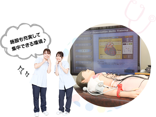 病院と同じ設備を持つ広い実習室、在宅看護の実習室、情報処理室、看護の文献がそろった図書室…看護の学習に集中できる施設が充実しています。最新設備を使い、納得するまで練習を繰り返すことで、実践に則した技術を身に付けることができます。
